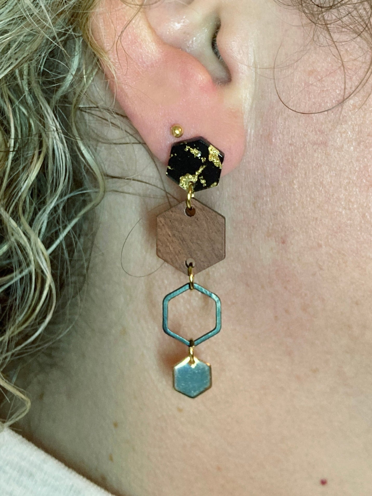 Mooie zwarte stud met goudkleurige accenten, zwart metaal, hout en een 18k verguld messing hangertje. Stekertje van stainless steel.