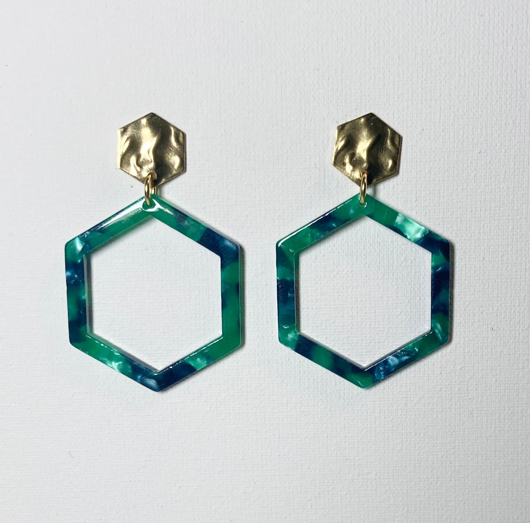 Lichtgewicht oorbellen. Een hanger in prachtige groene tinten aan een zeshoekige stud van 18k verguld stainless steel.