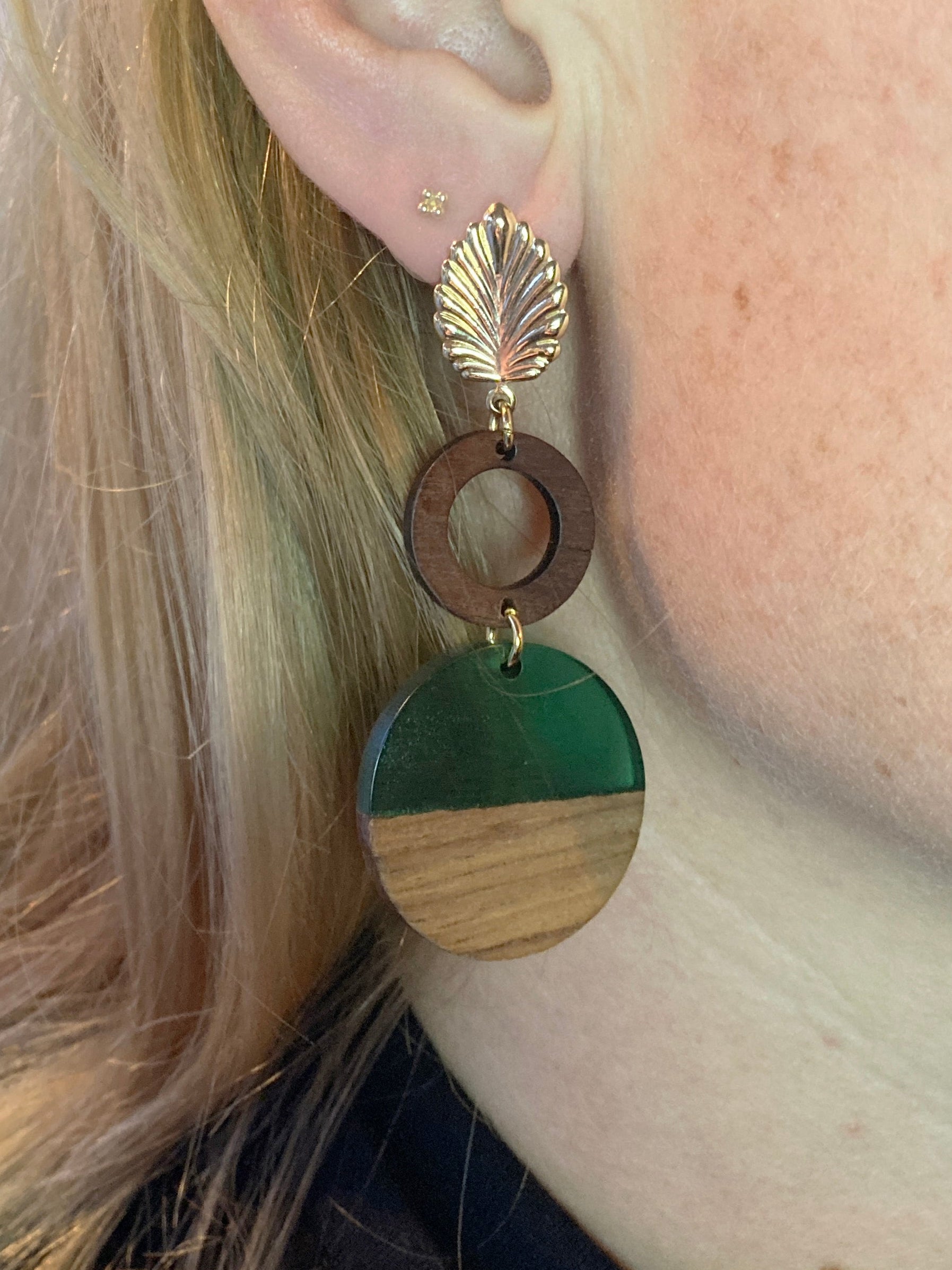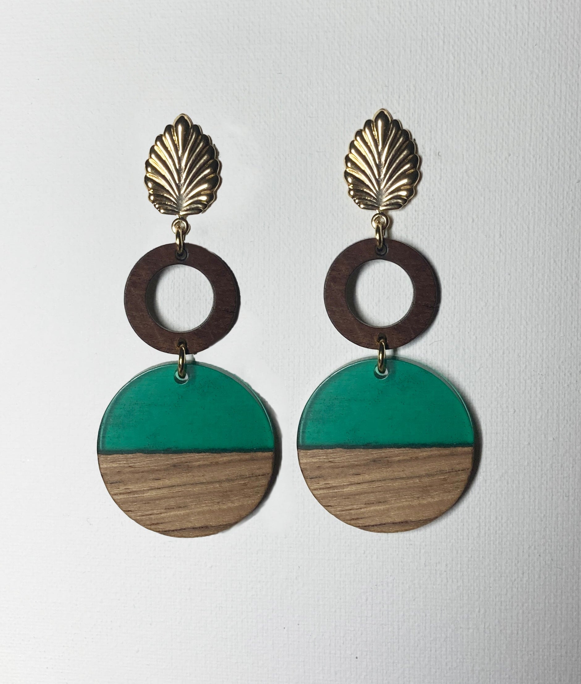 Oorbellen met een 18k vergulde stud in de vorm van een blaadje. Hanger van hout en transparante hars.