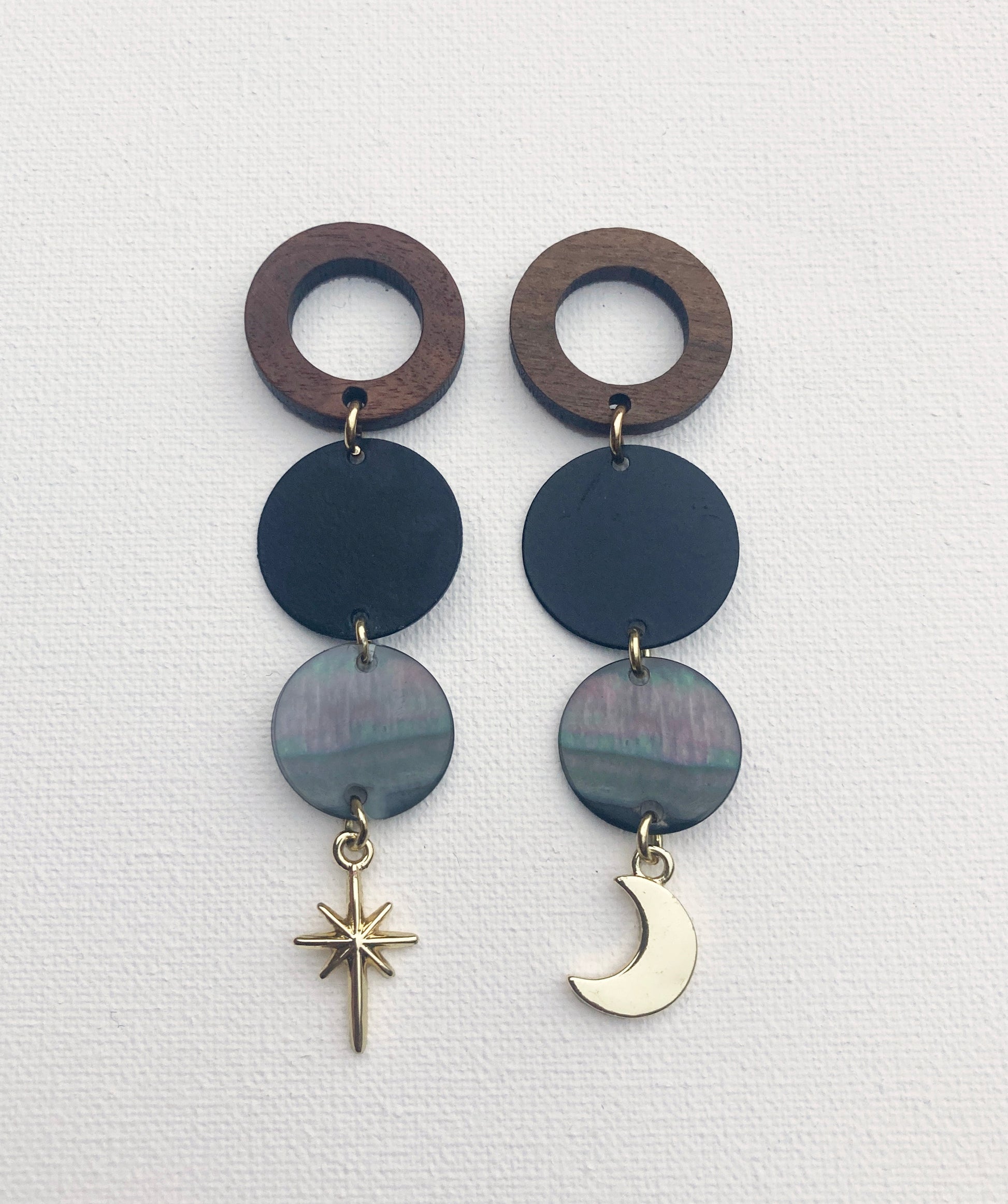 Oorbellen met een ster en maan van 18k verguld messing. Een stud van hout en daartussen prachtige schelp en zwart metaal.