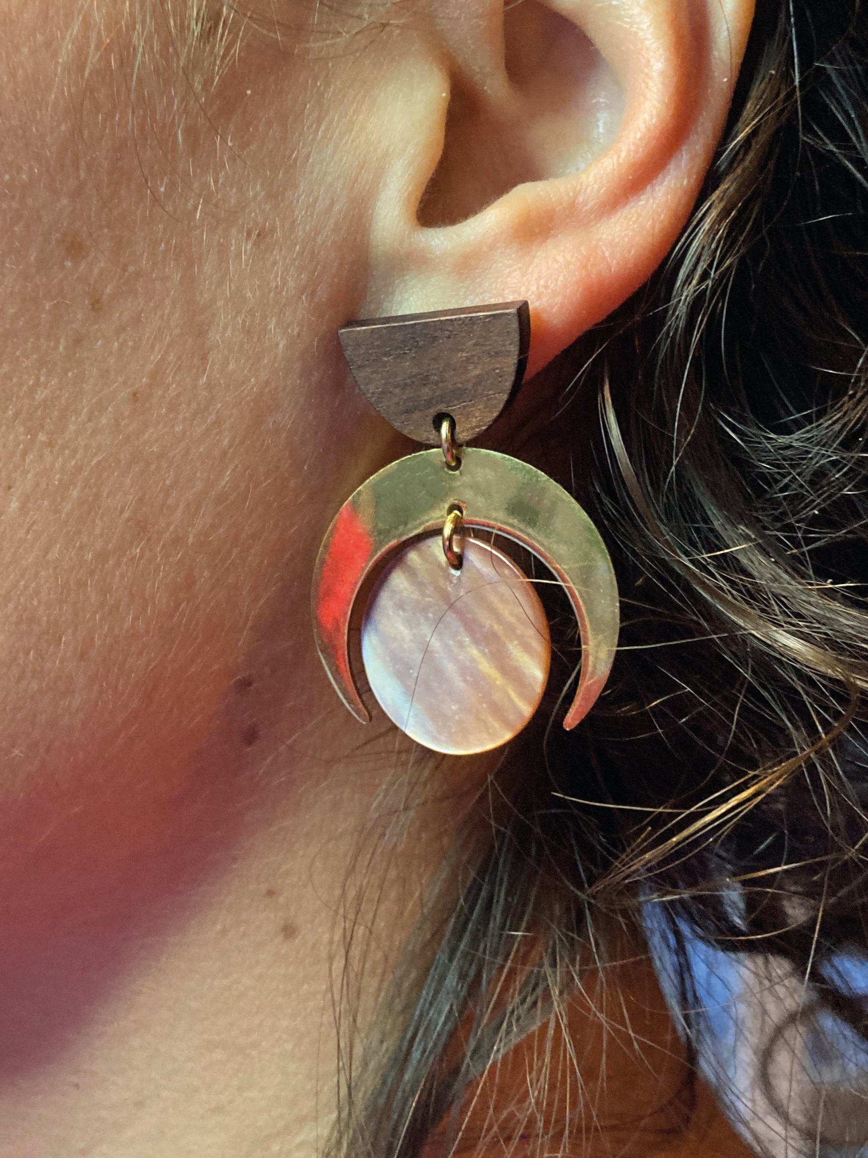 Prachtige oorbellen, een houten stud met 18k verguld stainless steel maan en hanger van schelp. Stekertje van stainless steel
