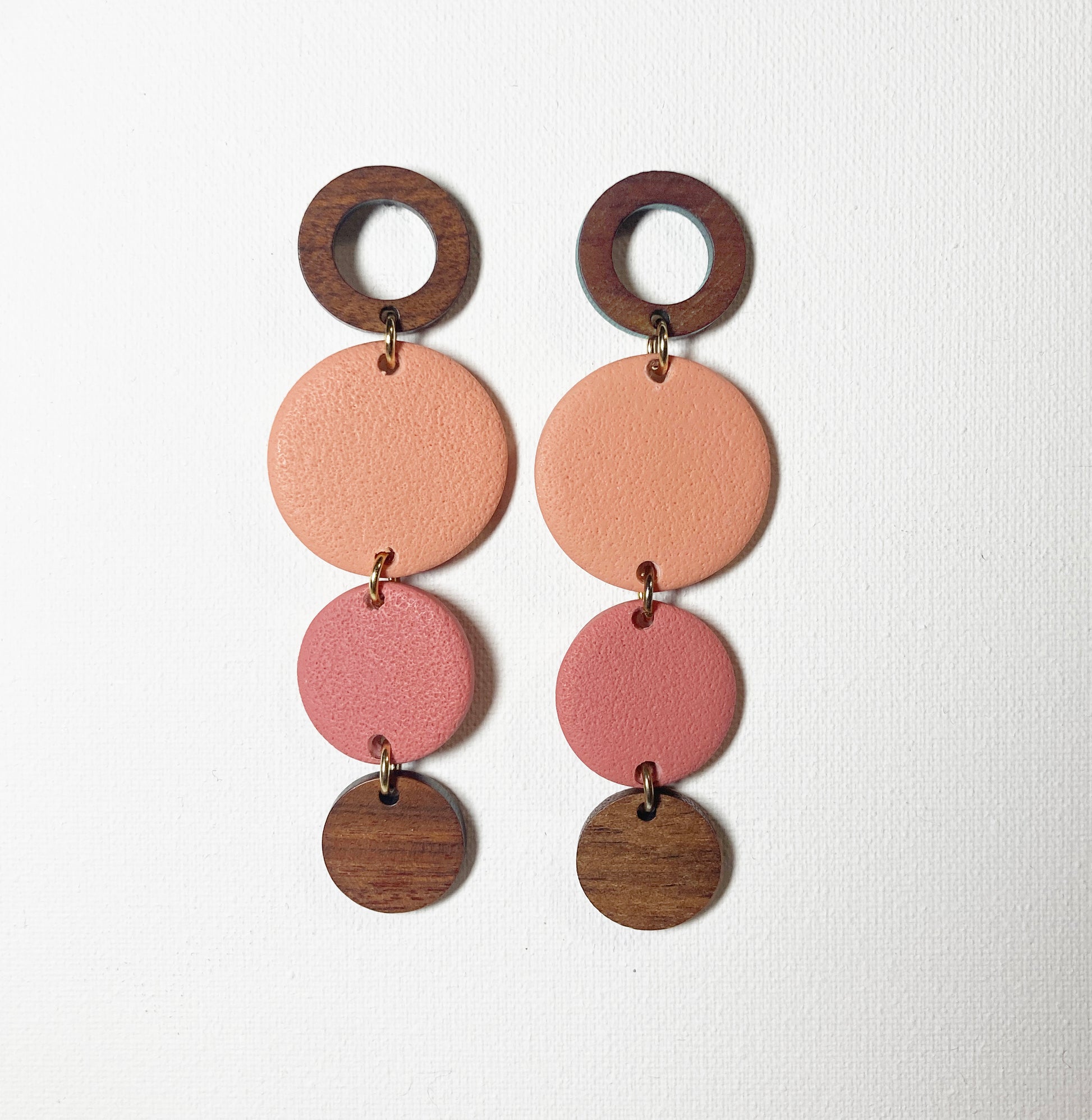 Go big! Maar wel lichtgewicht. Lange oorbellen met een houten stud en hangemaakte klei-onderdelen. Stekertje van stainless steel.