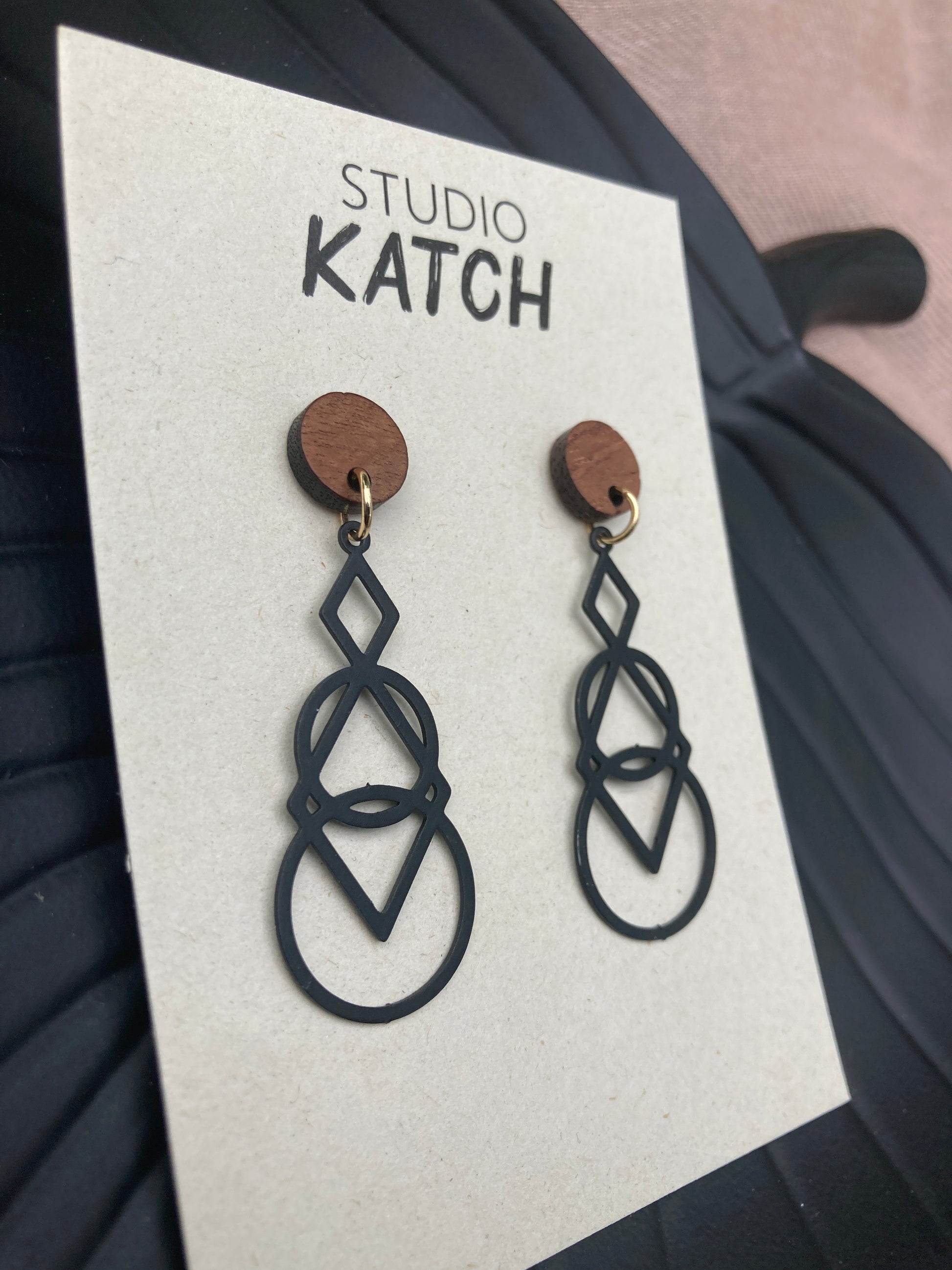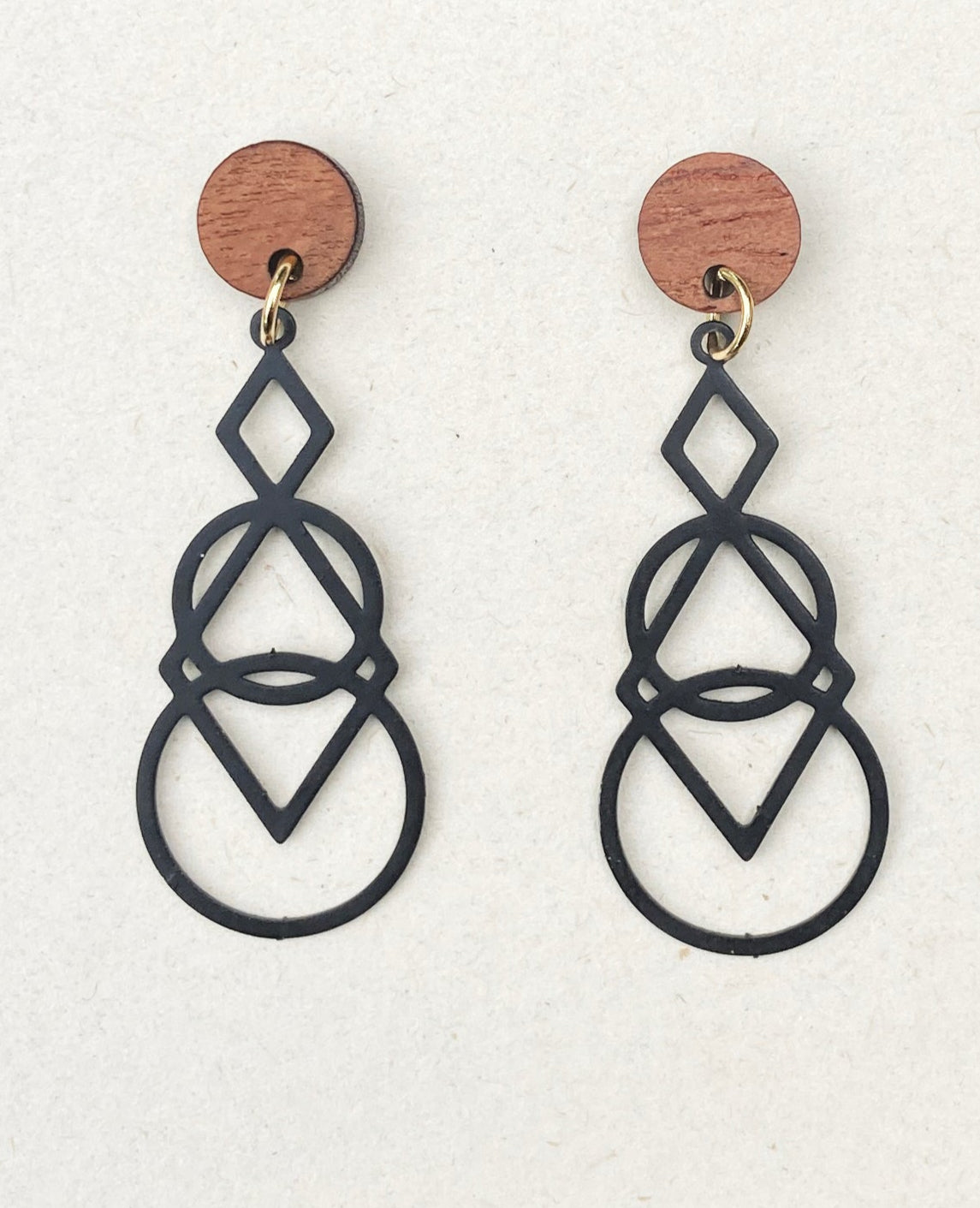 Mooie zwart metalen hangers met diverse geometrische vormen aan een houten stud. Stekertje van stainless steel.